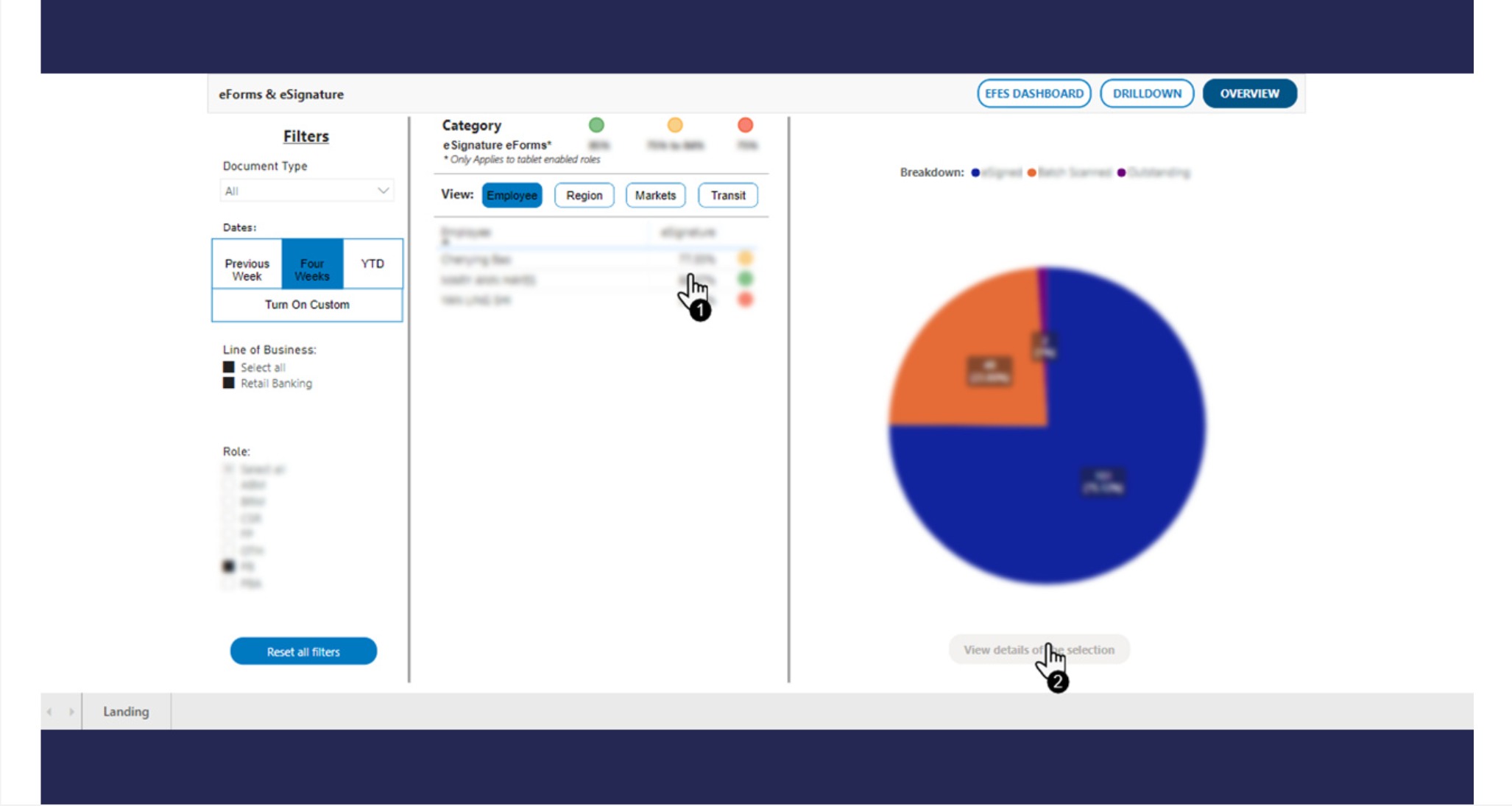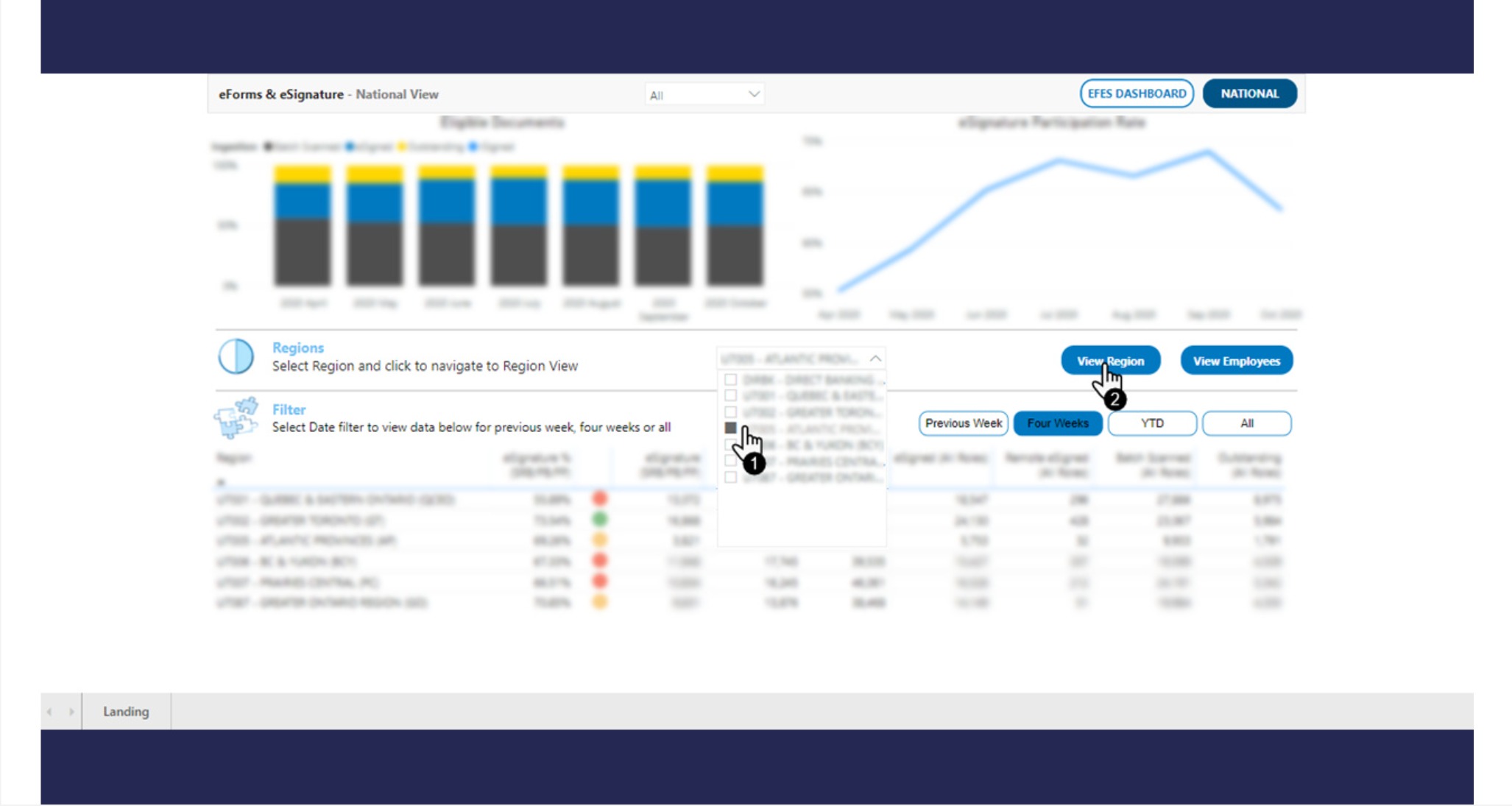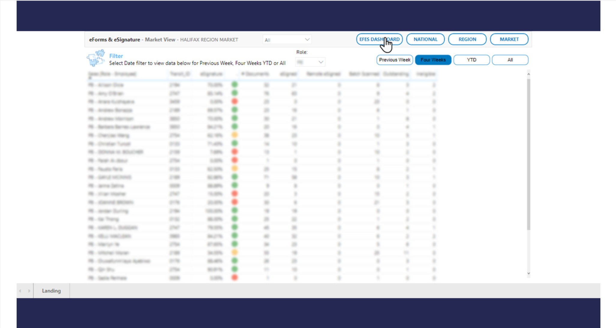 The project developed a comprehensive dashboard to support eSignature and eDocument adoption. The dashboard allowed both frontline staff and their managers to assess usage and adherence, from a comprehensive overview to detailed employee information.